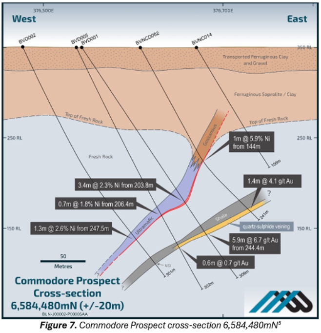 The Commodore prospect initially made headlines in 2021, where reverse circulation drilling intersected4 1 m @ 5.9% Ni from 144 m, an early demonstration of komatiite-hosted nickel sulphide potential at the project.