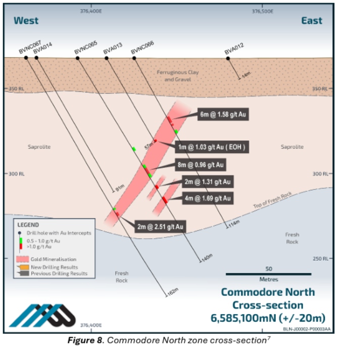 Drilling intersected gold associated with quartz veining within deeply weathered rocks. Results from BVNC065 included6 8m @ 0.96g/t Au from 74m, 2m @ 1.31g/t Au from 88m and 4m @ 1.69g/t Au from 96m.